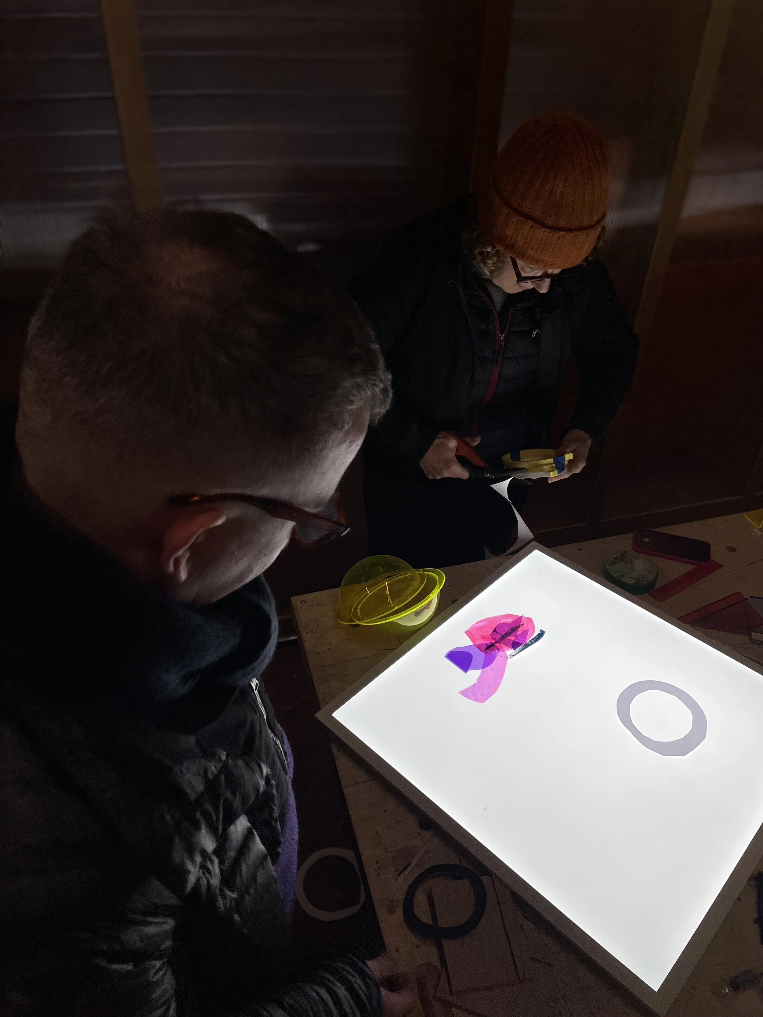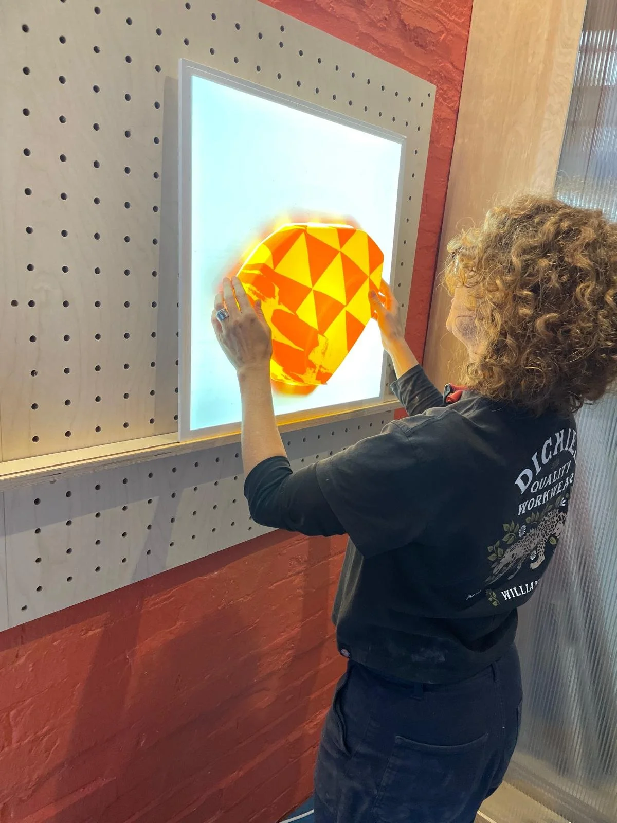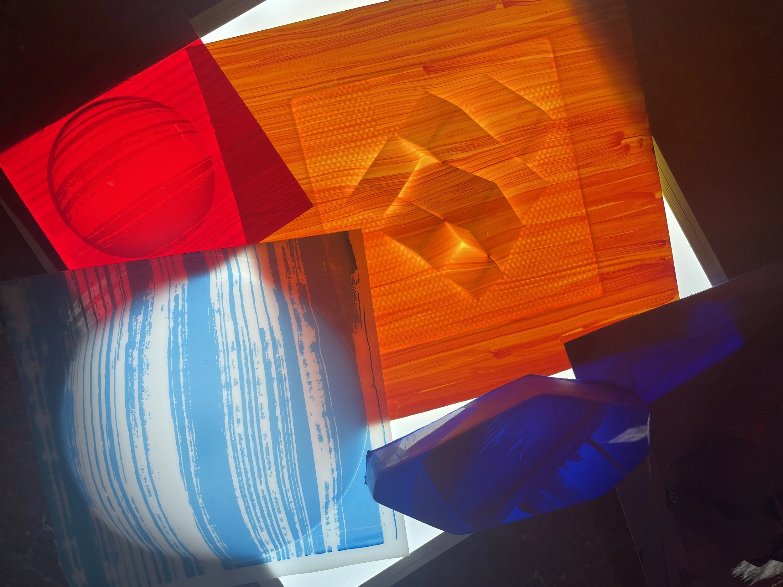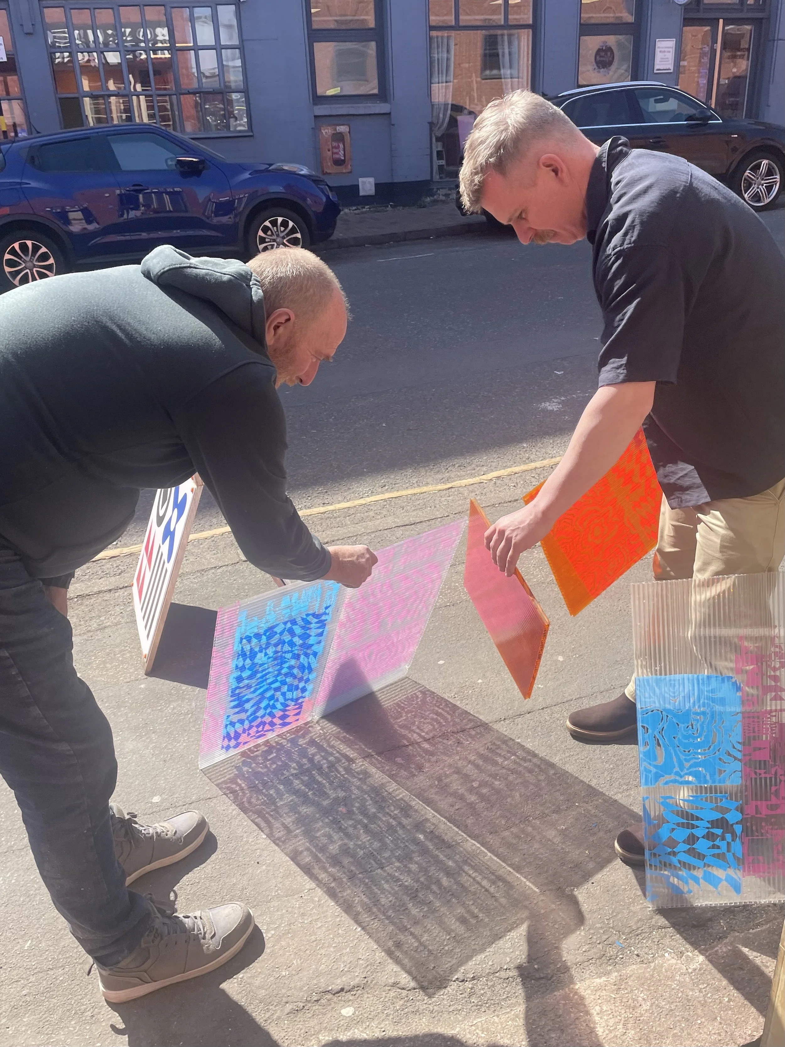 We both share a fascination with the changing surfaces of the urban environment and with Birmingham’s fast-moving creative landscape. The work is intentionally experimental, with light playing a key role. Building on Dual Works’ participation in the Birmingham Light Festival, we explored how painted, formed, and screen-printed surfaces can interact with illumination in surprising ways.