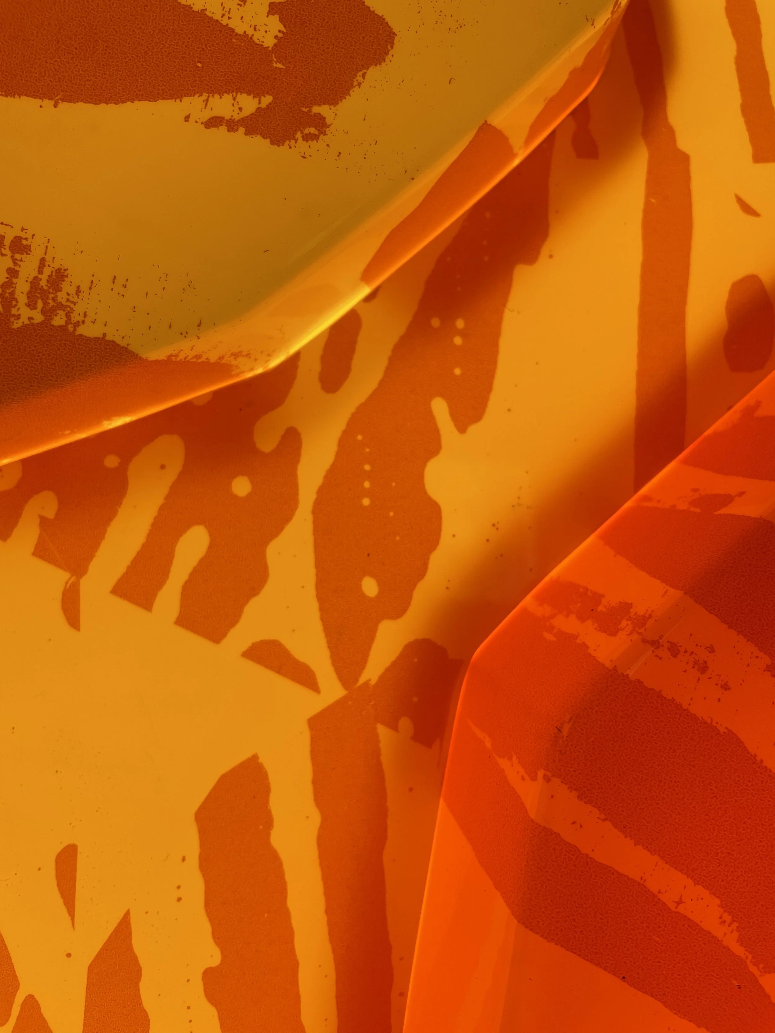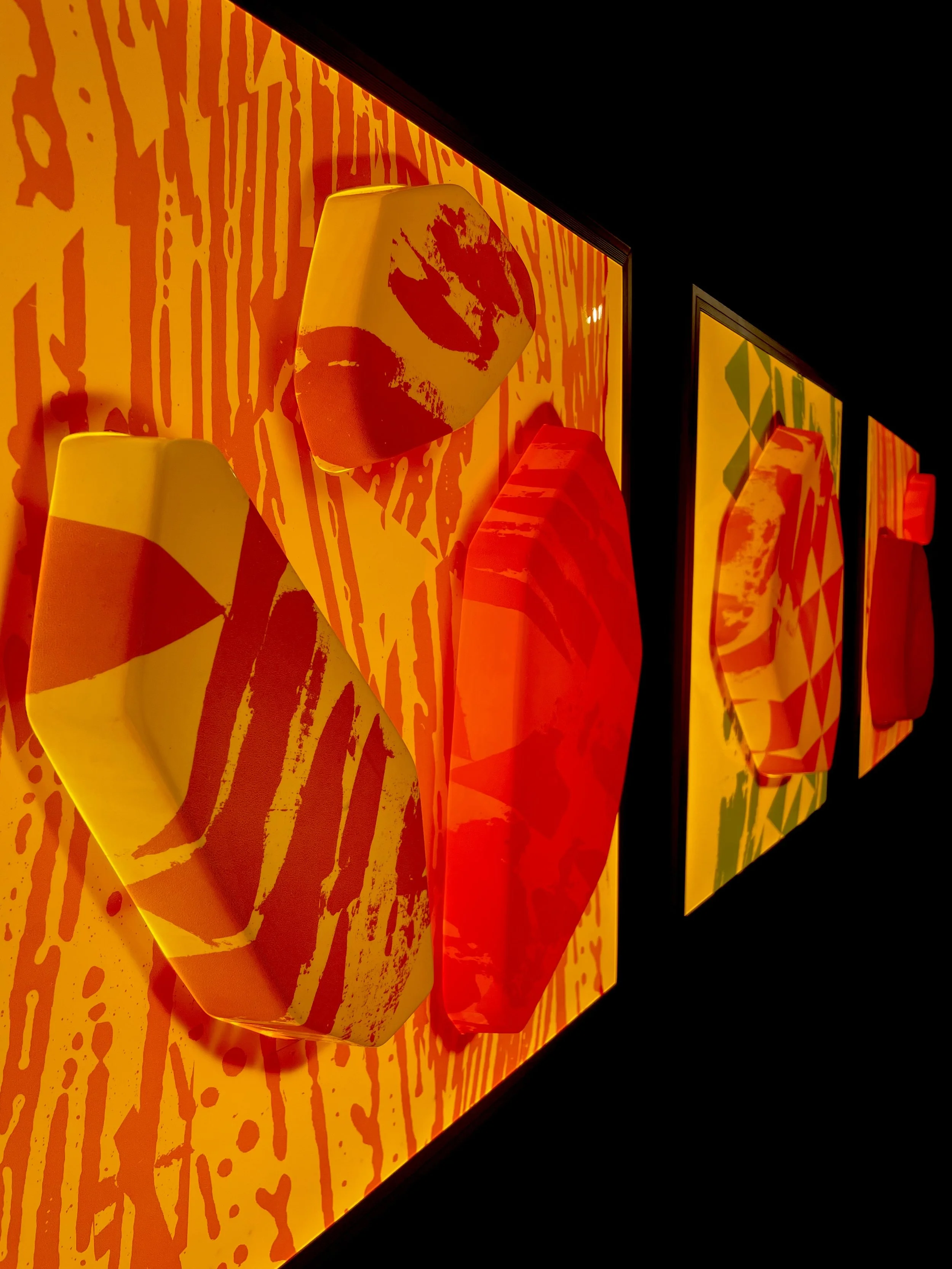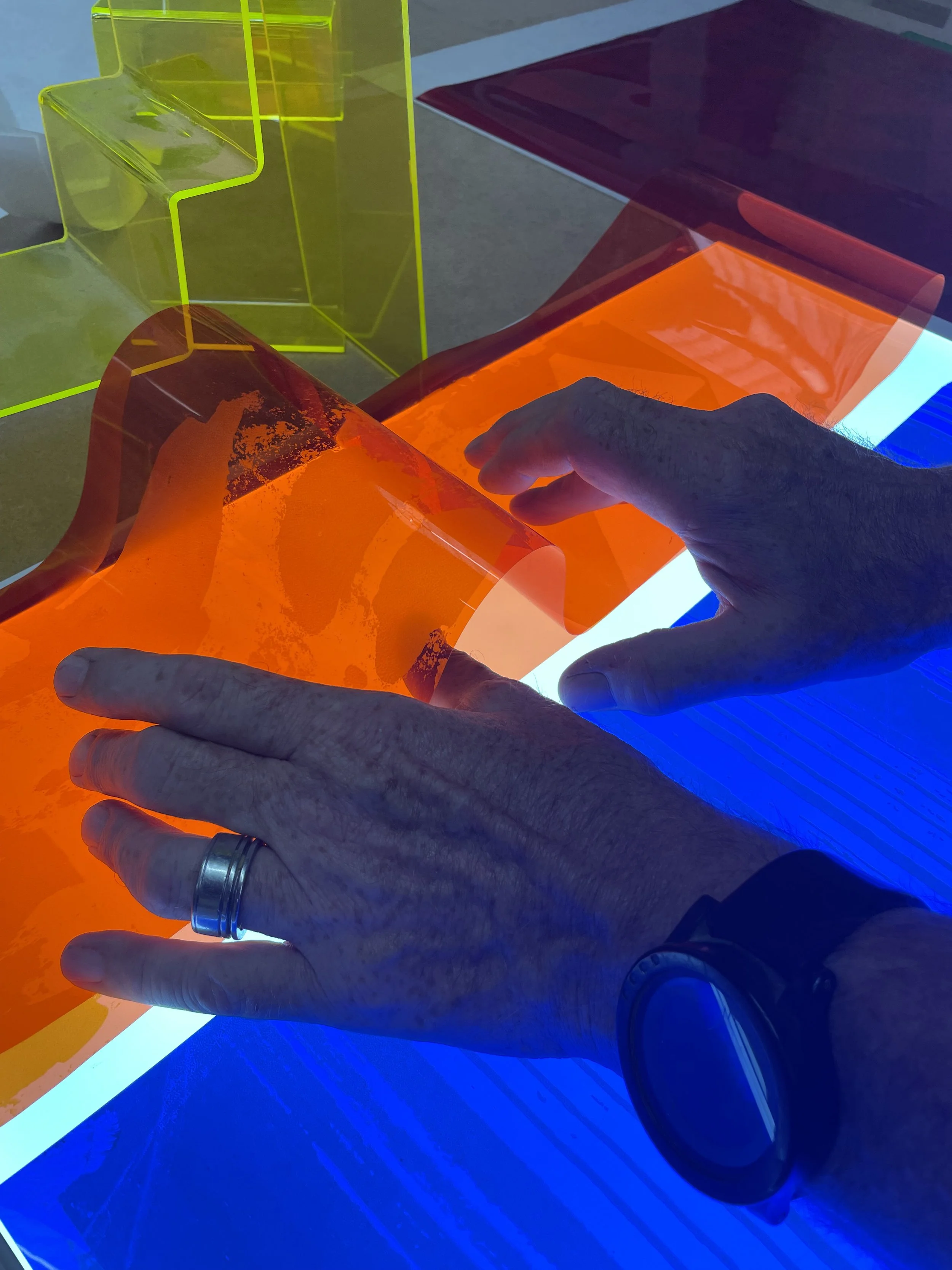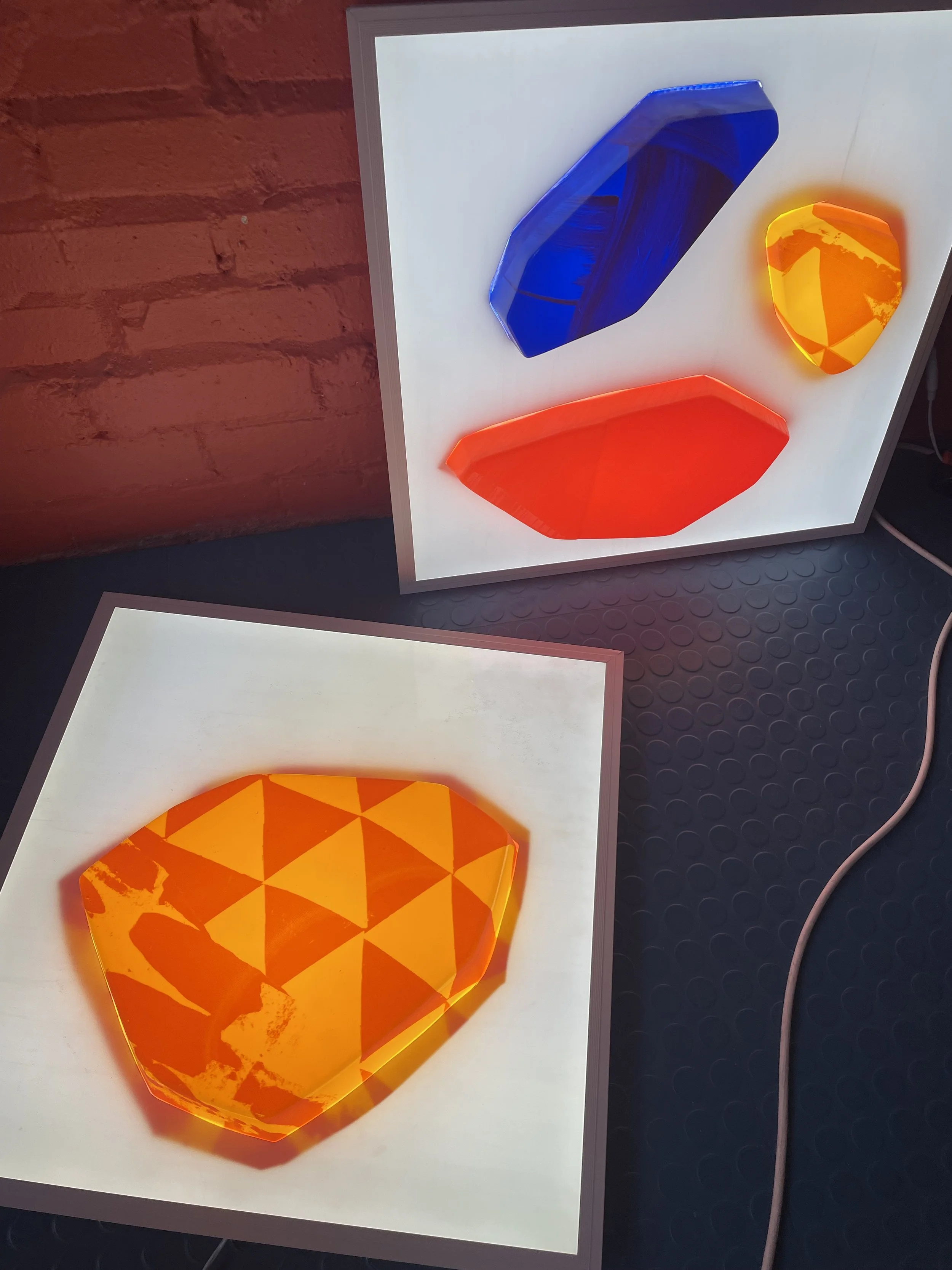 We both share a fascination with the changing surfaces of the urban environment and with Birmingham’s fast-moving creative landscape. The work is intentionally experimental, with light playing a key role. Building on Dual Works’ participation in the Birmingham Light Festival, we explored how painted, formed, and screen-printed surfaces can interact with illumination in surprising ways.